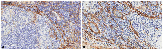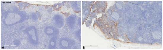 Representative microscopic images of tenascin-C expression (higher magnification) in a normal cancer-draining lymph node (A) and a normal non-cancer-draining lymph node (B).