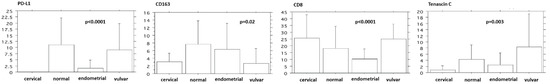 Regarding the differences (Figure 8) in the non-metastatic regional lymph nodes between the different primaries (Fisher test), vulvar cancer-draining lymph nodes showed higher PD-L1 values than endometrial cancer-draining and cervical cancer-draining lymph nodes (9 ± 10.748 for vulva, 1.512 ± 3.333 for endometrial, and 0 for cervical, p = 0.0004 and 0.039, respectively). Endometrial cancer-draining nodes had higher CD163 values (6.293 ± 6.842 vs. 2.682 ± 3.920, p = 0.0206) and lower CD8 values (10.341 ± 7.614 vs. 25 ± 11.019 p < 0.0001), compared to vulvar cancer-draining nodes. Endometrial cancer-draining nodes had also lower CD8 values (10.341 ± 7.614 vs. 25.778 ± 17.042, p = 0.006), compared to cervical cancer-draining nodes. Tenascin-C was also higher in vulvar cancer-draining nodes (8.318 ± 10.816), compared to endometrial (2.463 ± 3.88) or cervical (0.889 ± 1.269) cancer-draining lymph nodes (p = 0.0007 and 0.037, respectively). For distant nodes, the only statistically significant difference regarding primaries was the CD8 values, which were higher for the cervical, compared to the endometrial primaries (23.235 ± 13.572 vs. 9.417 ± 7.621, p = 0.01). Regarding low- and high-grade endometrial tumors’ regional draining nodes, the former showed lower S100A8/A9 (2.273 ± 2.947 vs. 10.154 ± 6.543, p = 0.0001) and CD163 (5.136 ± 6.198 vs. 9.077 ± 8.46, p = 0.0505) values.