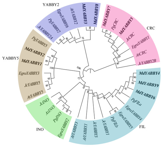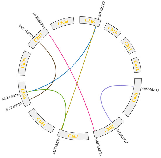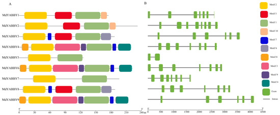 The gene location analysis showed that the nine MdYABBY genes were unevenly distributed on the chromosomes of the genome (Figure 1). MdYABBY1 was located on chromosome 1, MdYABBY2 and MdYABBY3 were distributed on chromosome 2, MdYABBY4 was located on chromosome 3, MdYABBY5 and MdYABBY6 were distributed on chromosome 5, MdYABBY7 and MdYABBY8 were distributed on chromosome 7, and MdYABBY9 was located on chromosome 9, while chromosomes 4, 6, 8, 10, 11, and 12 did not have MdYABBY genes.