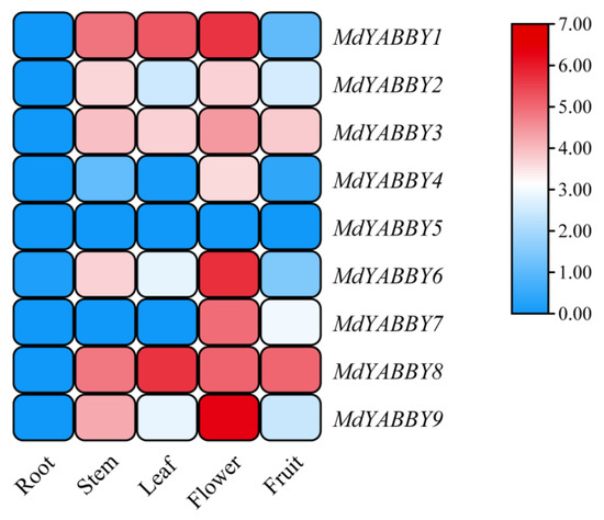 All the MdYABBY genes showed low expression in the root, and MdYABBY5 showed low expression in all organs. MdYABBY9 and MdYABBY6 showed high and medium expression in the flower and stem, respectively, but low expression in the leaf, root, and fruit. MdYABBY4 was highly expressed in the flower but showed low expression in the other organs. MdYABBY7 was significantly expressed in flowers, generally expressed in the fruit, and showed low expression in the other organs. MdYABBY2 was highly expressed in the flower and stem, normally expressed in leaf and fruit, and showed low expression in the root. Elevated expression of MdYABBY1 was observed in the flower, leaf, and stem, but a low expression was observed in the root and fruit. MdYABBY3 and MdYABBY8 showed significant expression in the flower, leaf, fruit, and stem, but low expression was noticed in the root (Figure 7).