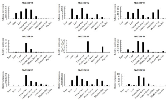 The tissue-specific expression was further evaluated (Figure 8). The RT-qPCR result showed that most MdYABBY genes were expressed in multiple tissues and some showed similar expression trends in different tissues. MdYABBY1−MdYABBY9 had a low expression level in the root and big fruit. MdYABBY6 and MdYABBY9 were expressed in stem, leaf, flower, and fruit, and the highest expression was observed in the flower bud and medium flower. The expression level of MdYABBY4 was high in the flower bud, and a medium expression was seen in medium flower. It had low expression in leaf, stem, mature flower, and different stages of fruit development. MdYABBY1 had the maximum expression in the flower bud, followed by medium flower, and medium expression was observed in leaf, stem, and mature flower. The expression level of MdYABBY7 gradually decreased during fruit and flower development, while it was not expressed in stem, root, and leaf. MdYABBY2 and MdYABBY8 also showed a decreasing expression trend during fruit and flower development. MdYABBY3 showed a trend of an initial increase followed by a decrease during fruit and flower development. MdYABBY5 was only expressed in medium flower and medium fruit.