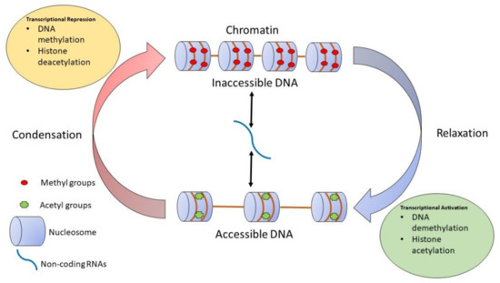 The diagram shows how gene expression is subject to epigenetic regulation. Epigenetic alterations can occur as DNA methylation and/or histone modifications and modify the accessibility of genes to the transcriptional machinery. This takes place either by inducing a relaxed/open or condensed/closed chromatin state. In addition, non-coding RNAs such as miRNAs can regulate the cell phenotype by repressing or enhancing the expression of gene transcripts. These non-coding RNAs can themselves be epigenetically regulated. Reprinted from [3].