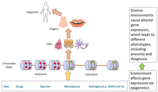 Gene-environment interactions during development and disease occur at different levels. Environmental factors can lead to either inhibition or enhancement of gene expression by incorporating these factors through epigenetic processes such as chromatin remodeling. While the environmental effects manifest themselves initially at the cellular level, they are then incorporated at all levels from cells to the whole organism. Disease etiology occurs in the same hierarchical sequence. In this particular case, SARS-CoV-2 alters epigenetic state contributing to anosmia and dysgeusia. Adapted from [3].