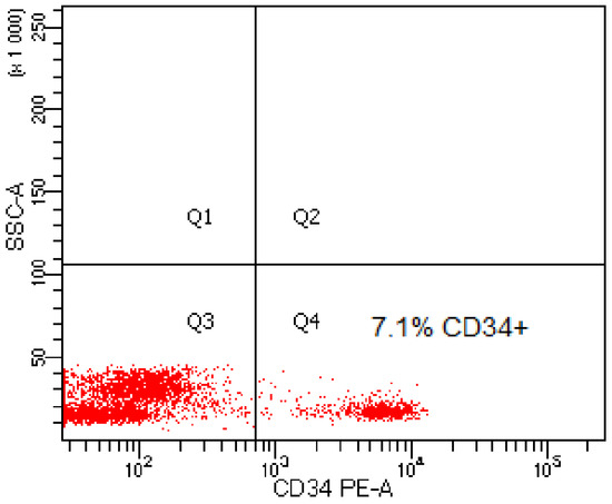 In the graft material obtained from 40 patients, the content of CD34+ cells was in the range of 6.1–13.35% (mean value 7.03% of CD34+ cells) (Table 1). Figure 1 shows an example of a cytogram showing the content of CD34+ cells in the graft material from one of the patients.