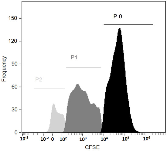 To determine cell cycle progression, analysis of the proliferation with a Cell Trace CSFE Kit was performed during cell culture. CFSE dye was added at the beginning of the cell culture and cytometric analysis was performed after 9 days of culture. Cytometric analysis showed the proliferating potential of the examined cells (Figure 2). The presented histogram shows three generations of cells: P0, P1 and P2, where P0 is the population of CD34 + cells obtained after magnetic sorting, while the populations P1 and P2 are the populations resulting from cell division during cell culture of the P0 population.