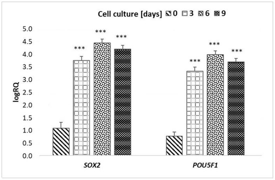 Mean and standard deviation values of LogRQ for the SOX2 gene and POU5F1 gene in peripheral blood stem cells prior to culture (day “0”) and on subsequent days of culture (3, 6 and 9 days). Explains: *** p < 0.001.