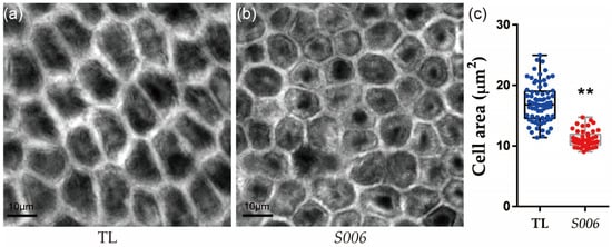 Comparison of seed-integument cells between S006 and wild-type plants. (a) Image of integument cells in wild type; (b) image of integument cells in S006 mutant; (c) statistical analysis of cell area of S006 and wild-type seeds. Asterisks indicate a significant difference according to Student’s t-test (**, p < 0.01).
