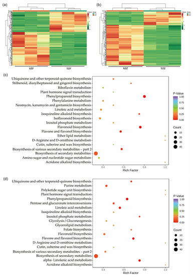 Differentially accumulated metabolites among seed coats and cotyledons of S006 vs. TL. (a) A heat map of differential metabolites among SZP vs. TZP; (b) a heat map of differential metabolites among SZZ vs. TZZ; (c) KEGG-pathway-enrichment analysis of differential metabolites among SZP vs. TZP; (d) KEGG-pathway-enrichment analysis of differential metabolites among SZZ vs. TZZ.