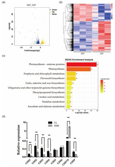Transcriptome analysis of S006 and wild type. (a) A volcano plot of DEGs between S006 and wild type; (b) a heat map of DEGs between S006 and wild type; (c) the ten KEGG pathways that were the most enriched in DEGs; (d) the RT-qPCR verified the expression of nine CHS genes. Asterisks indicate a significant difference according to Student’s t-test (**, p < 0.01).