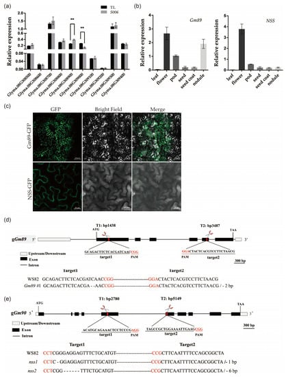 Expression patterns, protein subcellular localization, and mutant constructions of Gm89 and NSS genes. (a) Flanking-gene expressions of T-DNA insertion site in S006 mutant. Asterisks indicate a significant difference according to Student’s t-test (**, p < 0.01); (b) expression patterns of Gm89 and NSS. (c) subcellular localization of Gm89 and NSS proteins. Bars for upper row = 50 μm, bars for lower row = 20 μm; (d) identification of Gm89 mutant. The red letters represent the PAM site; (e) identification of nss mutants. The red letters represent the PAM site.