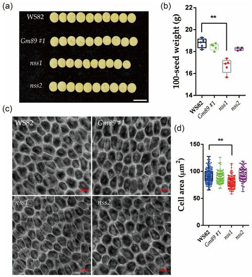In order to further clarify the functions of the Gm89 and NSS genes in the S006 phenotypes, the agronomic traits of the transformed plants were investigated. The results showed that the 100-seed weight of nss1 was significantly lower than that of WS82, while the 100-seed weight of Gm89#1 and nss2 was not significantly different from that of the wild type (Figure 6a,b). The integument cells of the mutant seeds were further observed by confocal microscopy, and the cell area of nss1 was significantly reduced compared with the wild type, indicating that NSS-gene mutation contributed to S006-seed-size phenotypes. The cell area of Gm89#1 and nss2 was not significantly different from that of WS82, which was consistent with the phenotypes of seed size, suggesting that neither the Gm89 gene nor the two-amino-acid deletion in nss2 produced seed-size phenotypes.