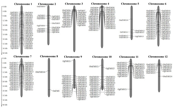 Information regarding the coordinates of FMO genes belonging to different Oryza species was obtained from the Gramene database and genes from all the species were mapped on the rice chromosomes using MapGene2Chromosome v2 [75]. We found that FMO genes are mainly distributed on 11 out of 12 rice chromosomes. Unlike other chromosomes, Chromosome (Chr) number 8 was the least populated, consisting of single FMO gene from O. brachyantha (ObrFMO18) and O. nivara (OnFMO14) (Figure 1). Among these 12 chromosomes, the maximum members of a single species are present on Chr 1 and Chr 4 and the lowest are found on Chr 5 and Chr 8. Furthermore, careful observation of chromosomal distribution of FMO genes revealed that the majority of the orthologous FMO genes in different Oryza species were found in the same order on a particular chromosome. Also, it is noteworthy that some FMO genes form clusters as they are adjacent to each other on the chromosomes. For example, in Oryza sativa subsp. japonica OsJFMO7 and OsJFMO8 forms a cluster on Chr 3, OsJFMO13 and OsJFMO14 on Chr 6, OsJFMO16, OsJFMO17, OsJFMO18, and OsJFMO19 on Chr 7, OsJFMO22 and OsJFMO23 on Chr 9, OsJFMO24 and OsJFMO25 on Chr 10. Further, OsJFMO26 and OsJFMO27 forms a cluster on Chr 11.