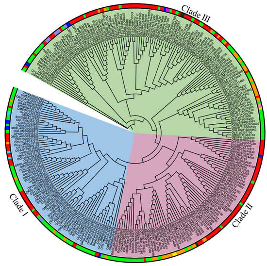 To determine the evolutionary and phylogenetic relationships among FMO proteins in different Oryza species, a rooted tree was constructed using MEGA7 software [76] and the proteins were grouped into three different clades based on their putative functions (Figure 2). Clade I was assigned as a pathogen defense clade, Clade II as an auxin biosynthesis clade, and Clade III as an S-oxygenating clade based on its constituents’ homology to known and characterized Arabidopsis members [14,21]. Cultivated rice (O. sativa subsp. indica, O. sativa subsp. japonica, O. glaberrima) has 8 members in Clade I, 6–7 in Clade II and 10–14 members in Clade III. In wild rice species (O. brachyantha, O. punctata, O. meridionalis, O. glumaepatula, O. barthii, O. nivara and O. rufipogon), there are 4–9 members in clade I, 5–8 members in clade II and 8–13 members in clade III. Most family members belong to the S-oxygenating clade. We also noticed that OnFMO10 is the outlier in the phylogenetic tree (Figure 2). This might be because of its lower homology to all the other protein sequences of the Oryza species.