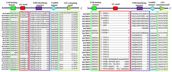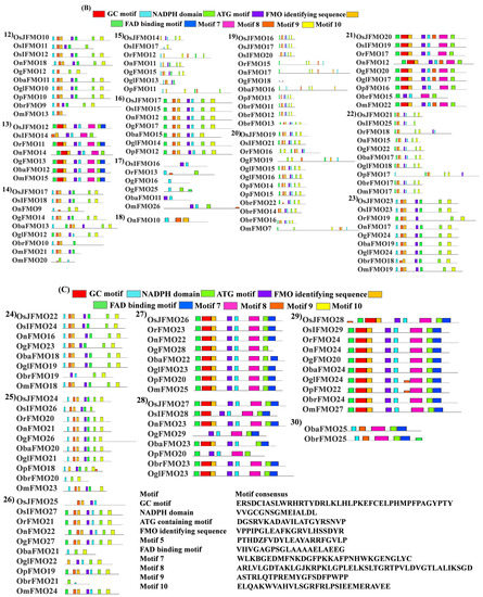 In our analysis, we found that almost all of these motifs were present in the protein sequences of different Oryza species. However, few of them lack these motifs. The FAD-binding motif was mostly present at the N terminus of the protein, while the ATG-containing motif was present at the C terminus. Also, it was observed that ATG-binding motif was present twice in some of the proteins. Besides these, 5 more conserved motifs were seen in these sequences, which are named motif 5, motif 7, motif 8, motif 9, and motif 10 in this study. Again, OnFMO10 (Figure 4B(18)) shows the difference in protein motif arrangement from the rest of the members, with only 3 motifs present in total, NADPH-containing motif, motif 5, and motif 9. OgFMO16 (Figure 4B(17)) shows the presence of only 1 motif, the NADPH-binding motif, and OsIFMO16 shows the presence of two motifs, NADPH and FMO-identifying motifs (Figure 4A,B). This is probably because this gene has not been sequenced properly and the available sequence in the Gramene database has missing 5′ bases, which are denoted as a stretch of N in the database. In the 5th and 30th sets (Figure 4A(5),C(30) of orthologs that have only wild rice members, the FMO-identifying sequence was absent while 5–6 other conserved motifs were present.