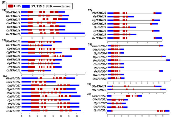 In the nineteenth set, ObaFMO16, OnFMO18, and OrFMO15 consisted of 8–10 exons, while the rest were either intronless or consisted of a maximum of two exons. Another example of this arrangement would be the twentieth set, wherein OgFMO19, OmFMO7 and OrFMO16 contained varying numbers of exons ranging from 4–8, while others consisted of two exons or no introns at all (Figure 5C(19,20)). In the sixteenth set, all the genes were intronless except ObaFMO15 (Figure 5C(16)). In the twenty-eight set of orthologs, ObaFMO24, OmFMO27, OrFMO24 and OglFMO24 consisted of longer introns and five exons, one more than the other genes in the same set (Figure 5D(28)). Overall, it can be seen that the FMO gene family has variable sizes of exon, intron, and UTRs.