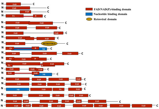 To assess the domain architecture of the identified putative FMO proteins, analysis was done using the SUPERFAMILY database [81]. The protein sequences were found to harbour single-to-multiple copies of the FAD/NADP-binding domain. Additionally, a nucleotide-binding domain and retroviral domains were also found in a few of the sequences like OgFMO19, OgFMO2, ObrFMO25, and ObaFMO2, respectively. While all the FMO family proteins of the cultivated rice varieties, both indica and japonica, consisted of single-to-double repeats of the domain, wild relatives of rice mostly contained two-to-five repeats of the domain such as OpFMO11, OpFMO17, OrFMO15, OrFMO18, OnFMO18, OgFMO19. OnFMO18, and OgFMO19. In fact, OmFMO7 was found to harbor eight copies of the domain, the most among all the proteins in wild vs cultivated varieties. The presence of multiple domains also correlated with the sequence length of the proteins. Interestingly, we also found a few of the domains to be arranged in such a way that they overlapped with the adjacent domain repeat, while others were split because they were linked together by a linker or spacer region (Figure 6).