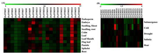 The spatial expression profiling revealed differential expression of the genes in the different tissues, namely endosperm, embryo, seedling, culm, leaf, flag leaf, panicle, spikelet, and root. OsJFMO6 and OsJFMO28 were found to be highly expressed only in the endosperm. Most of the other genes such as OsJFMO5, OsJFMO8, OsJFMO14, OsJFMO19, OsJFMO22, OsJFMO23, OsJFMO3, OsJFMO4, OsJFMO20, and OsJFMO7 showed low to medium level of expression in all the tissues. Interestingly, the transcript abundance of only one gene, OsJFMO24, was maintained across tissues. OsJFMO21 and OsJFMO9 showed medium-to-high levels of expression in all the tissues. In fact, OsFMO9 showed maximum expression (14.36-fold change) in roots as compared to other genes. OsJFMO9 and OsJFMO10 were found to be highly expressed in the panicle (11.66- and 10.82-fold, respectively) and spikelet (11.95- and 11-fold, respectively). OsJFMO9 was highly induced (13.33-fold change) in the roots of the seedling. OsJFMO25 and OsJFMO9 showed higher expression (11.26-, 11.04-, and 10.79-fold) in the embryo. (Figure 7A).