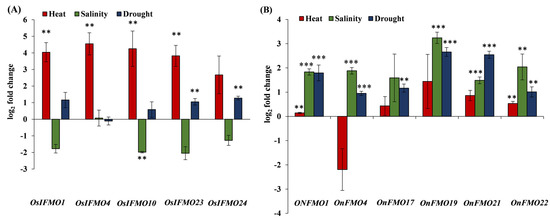 Next, we validated some of the genes encoding for the FMO family of proteins based on the publicly available stress-mediated expression profiling data. The genes selected belong to the three different clades. Leaves cut from one month old plants of the cultivated species Oryza sativa subsp. indica and its closest wild rice relative, Oryza nivara, were subjected to different stress conditions such as high temperature, salinity, and drought. In Oryza sativa subsp. indica, OsIFMO1, OsIFMO4, OsIFMO10, OsIFMO23 and OsIFMO24, five genes were found to be significantly upregulated under high temperature stress. However, none of the genes show significant upregulation under drought stress. A contrasting trend was observed in salinity stress where OsIFMO1, OsIFMO10, OsIFMO24 and OsIFMO10 shows downregulation (0.07 to −2.04-fold) (Figure 8A). Under drought stress, all of the genes, OnFMO1, OnFMO17, OnFMO21, OnFMO4, and OnFMO20, were significantly up regulated in the wild relative O. nivara. In heat stress, four of them, OnFMO1, OnFMO17, OnFMO19, OnFMO21 and OnFMO22 shows upregulation. In salinity stress, OnFMO19 (log 2-fold change, 3.24) and OnFMO22 (log 2-fold change, 2.04) shows perturbation in a significant range (Figure 8B). The ortholog of OnFMO22 i.e., OsIFMO27, was not detected in any of the stresses, thus indicating null expression of the gene at this developmental stage. This is the first report on experimentally validated expression profiling of FMO encoding genes from the wild rice O. nivara. Our expression profiling data was mostly, but not entirely, correlated with publicly available expression data of Oryza sativa subsp. japonica. OsIFMO10 and OsIFMO24 show a similar trend in heat and drought stress but an opposite trend in salt stress. Similarly, OsIFMO1 and OsIFMO4 show similar trends in drought and salinity, but opposite trends in heat stress. Thus, it can be concluded that, while FMO encoding genes in indica variety are induced by heat, their orthologs in O. nivara are induced by salinity and drought.