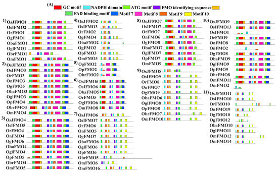 In our analysis, we found that almost all of these motifs were present in the protein sequences of different Oryza species. However, few of them lack these motifs. The FAD-binding motif was mostly present at the N terminus of the protein, while the ATG-containing motif was present at the C terminus. Also, it was observed that ATG-binding motif was present twice in some of the proteins. Besides these, 5 more conserved motifs were seen in these sequences, which are named motif 5, motif 7, motif 8, motif 9, and motif 10 in this study. Again, OnFMO10 (Figure 4B(18)) shows the difference in protein motif arrangement from the rest of the members, with only 3 motifs present in total, NADPH-containing motif, motif 5, and motif 9. OgFMO16 (Figure 4B(17)) shows the presence of only 1 motif, the NADPH-binding motif, and OsIFMO16 shows the presence of two motifs, NADPH and FMO-identifying motifs (Figure 4A,B). This is probably because this gene has not been sequenced properly and the available sequence in the Gramene database has missing 5′ bases, which are denoted as a stretch of N in the database. In the 5th and 30th sets (Figure 4A(5),C(30) of orthologs that have only wild rice members, the FMO-identifying sequence was absent while 5–6 other conserved motifs were present.