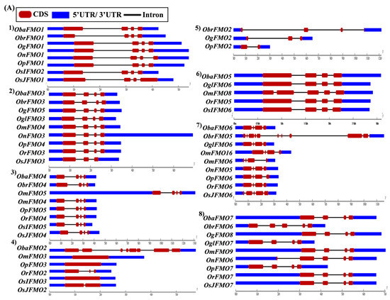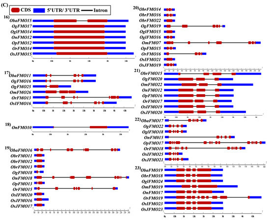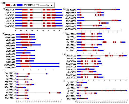 The exon–intron arrangement for the genes encoding the FMO proteins in different Oryza species was evaluated using the Gene Structure Display Server tool [80]. The gene structures of the orthologous genes have been represented together in Figure 5. The orthologs were largely found to share similar exon–intron arrangements, with a few exceptions. OnFMO3 possessed an exceptionally long 3′ UTR, while OmFMO5 had a long 5′ UTR (Figure 5A(2,3)). The exon–intron arrangement of ObaFMO2 was found to be completely different from that of the other members in the set, consisting of eight exons, while the rest comprised one to a maximum of three exons (Figure 5A(4)). In the fifth set, ObrFMO2 had longer introns as compared to OgFMO2 and OpFMO2 (Figure 5A(5)) A similar observation was also made for ObrFMO5, ObaFMO10, OpFMO11 and OrFMO15 and (Figure 5A(7),B(11,15),C(19)).