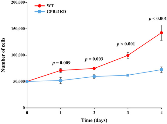 The proliferation of WT and GPR41KD BRECs. These cells were cultured for 1, 2, 3, or 4 days. Data are presented as means ± SEM (n = 3).