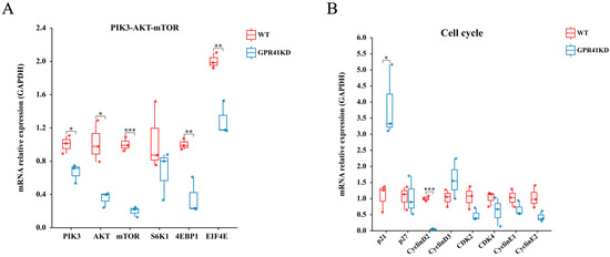 Expression of genes involved in PIK3-AKT-mTOR (A) and cell cycle signaling pathway (B) regulators in WT and GPR41KD BRECs in vitro (n = 3). * p ≤ 0.05, ** p ≤ 0.01, *** p ≤ 0.001.