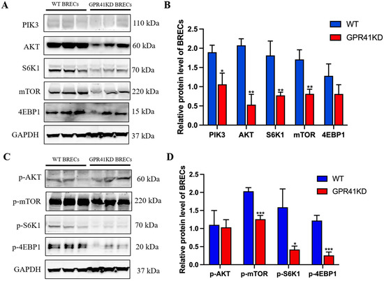 GPR41KD inhibits the expression of key proteins of the PIK3-AKT-mTOR pathway (n = 3). (A,B) GPR41KD inhibited the expression of PIK3, AKT, S6K1, mTOR. (C,D) GPR41KD inhibited the expression of p-mTOR, p-S6K1, p-4EBP1. GAPDH serve as the loading controls for normalization. The data are expressed as the mean ± SEM and analyzed by t-test. * p ≤ 0.05, ** p ≤ 0.01, *** p ≤ 0.001.