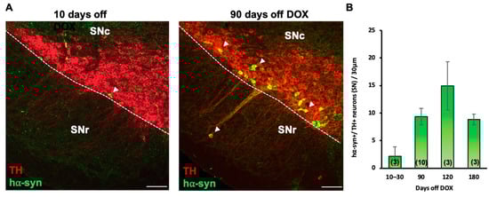 Inducible human A53T alpha synuclein accumulates over time. (A) Confocal images of coronal section (30 μm) through the substantia nigra compacta (SNc) and reticulata (SNr) of the PITX3-IRES2-tTA/tetO-A53T double-transgenic mice showing a substantial increase of hα-syn expression after 90 days off doxycycline (DOX) when compared to 10 days off DOX. Colocalization shows that hα-syn was selectively expressed in the TH+ cells (arrowheads) in the SN. Scale bars = 100 μm. (B) Quantification of neurons displaying hα-syn /TH colocalization shows a 2-fold increase in hα-syn expression after 90 days off DOX and a 3-fold increase after 120 days. The expression after 180 days off DOX was comparable to 90 days off DOX. Graphs show mean ± SEM. The number of animals is annotated in parentheses for each condition.