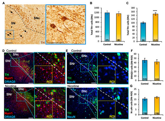 To determine whether the nicotine-mediated increase in the number of TH-expressing neurons occurs through recruitment of pre-existing SNr neurons to such a DAergic phenotype, we tested the effects of 2-week nicotine exposure on the SN of adult wildtype mice (P60). After nicotine exposure, brain tissue was labelled with the DAergic TH, neuronal NeuN, and nuclear DRAQ5 IHC markers. As observed in Pitx3-IRES2-tTA/tetO-A53T transgenic mice (Figure 2E), stereological quantification indicated that chronic nicotine exposure in wild-type mice significantly increased the number of TH+ cells (Figure 3A, arrows, inset) in the SNr (mean ± SEM: control = 101 ± 5, nicotine = 148 ± 7, t(19) = 5.01, p < 0.0001, Figure 2C), but not in the SNc (Figure 3B). All SNr TH-expressing cells in nicotine-treated mice expressed Nurr1 (Figure 3D, inset) and NeuN (Figure 3E, inset) markers. The increased number of TH+ neurons was not due to an increase of neuroproliferation or cell migration, as no change in the total number of DRAQ5+ (mean ± SEM: control = 46 ± 5, nicotine = 42 ± 5) and NeuN+ cells (mean ± SEM: control = 16 ± 1, nicotine = 17 ± 1) was observed in the nicotine-exposed group (Figure 3F,G).