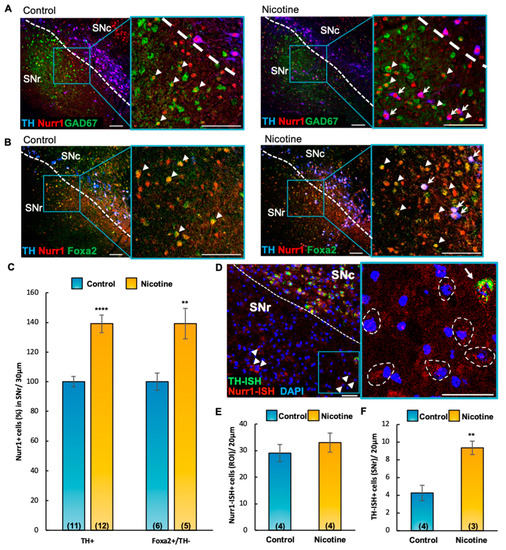 To understand the regulatory mechanism through which DAergic phenotype is acquired by non-DAergic SNr neurons in response to chronic nicotine exposure, we first evaluated the protein expression of TH, the glutamate-decarboxylase-67 (GAD67) labeling GABAergic cells, and the transcription factor Nurr1 across conditions (Figure 4A,B). Nurr1 protein, which is essential for the acquisition and maintenance of the DAergic phenotype [31,32], was detected in SNc TH+ neurons as expected. However, it was also clearly expressed in TH-negative GABAergic SNr cells, as shown by the GAD67+/Nurr1+ colocalization (Figure 4A, arrowheads). Co-activator Foxa2, which interacts with Nurr1 to promote the survival of midbrain DAergic neurons against toxic insults (Oh et al., 2015), displayed overlapping immunoreactivity in Nurr1+/TH-negative cells (Figure 4B, arrowheads). Nicotine-exposed mice (P60) displayed a significant increase in the number of Nurr1+/TH+ cells (Figure 4C, mean ± SEM: control = 100 ± 4, nicotine = 139 ± 6, t(21) = 5.51, p < 0.0001,) and a concomitant surge in the number of TH-negative neurons co-expressing Nurr1/Foxa2, when compared to controls (Figure 4C, mean ± SEM: control = 100 ± 5, nicotine = 139 ± 10, t(9) = 3.50, p < 0.01, Figure 4B, arrowheads).