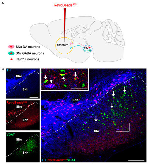 The nigrostriatal pathway, which is affected by neurodegeneration in PD, comprises DAergic neurons originating from the SNc and projecting to neurons located in striatum subnuclei. However, an additional fraction of nigrostriatal projections originates from GABAergic neurons located in the SNr [47,48,49]. To confirm the connectivity of GABAergic SNr-to-striatum projecting neurons, fluorescent RetroBeads (555 nm) were injected into the dorsal striatum (Figure 6A) for a retrograde tracing of striatal neuronal terminals to their SN somata. RetroBead-labelled cell bodies localized in the SNr identified SNr-to-striatum projecting neurons (Figure 6B). RetroBead accumulation was detected in both VGAT+/TH- (Figure 5B, arrows) and TH+ SNr somata (Figure 6B inset, arrowhead), in addition to all TH+ SNc-to-striatum projecting neurons. The fraction of Nurr1+ GABAergic neurons projecting to the striatum could serve as a reserve neuronal pool with the potential to acquire the TH phenotype and in turn replenish DA function in PD.