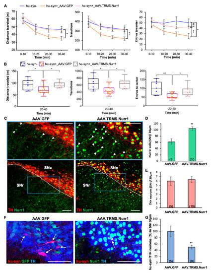 Because chronic nicotine exposure attenuated PD-related locomotor deficits and induced an increase in the expression of Nurr1 in the SNr (Figure 2), we next investigated the effects of expanding the pool of Nurr1-expressing neurons in the SN on locomotor performance in PD mice. To this aim, hα-syn+ mice were injected with AAV.TRMS.Nurr1 (hα-syn+_AAV.TRMS.Nurr1) to upregulate Nurr1 when a robust accumulation of hα-syn in TH+ neurons was already present (P111), while control hα-syn-negative mice (hα-syn-) and hα-syn+ mice were injected with a viral vector expressing GFP (hα-syn+_AAV.GFP). In agreement with our previous findings (Figure 2), hα-syn+ mice injected with AAV.GFP showed motor deficits when compared to hα-syn- mice (Figure 7A,B). A mixed-model ANOVA showed significant differences (Figure 7A) for distance traveled (time x group interaction: F(6,85) = 2.258, p < 0.05, group main effect: F(2,30) = 3.848, p < 0.05), transitions (group main effect: F(2,29) = 5.209, p < 0.05), and entries to center (time x group interaction: F(6,88) = 4.176, p < 0.001). Strikingly, hα-syn+ mice overexpressing Nurr1 did not show locomotor deficits, exhibiting a level of behavioral performance similar to hα-syn- mice. In the latter half (20–40 min) of the testing session, locomotor differences (Figure 7B, one-way ANOVA) were observed in distance traveled (F(2,30) = 5.445, p < 0.01), transitions (F(2,29) = 6.833, p < 0.01), and entries to center (F(2,28) = 9.293, p < 0.001) in Nurr1-treated animals as compared to the GFP control in hα-syn+ mice.