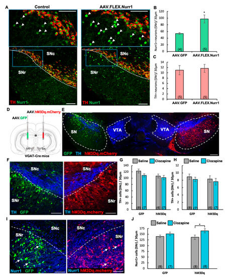 Given that chronic alteration of neuronal activity [45,51,52,53] and nicotine-exposure [44,54] can elicit TH plasticity within non-DAergic interneurons, we utilized DREADDs (designer-receptors-exclusively-activated-by-designer-drugs [55]) to test whether chronic depolarization of GABAergic neurons was sufficient to induce TH plasticity. To this end, we unilaterally injected a viral vector carrying a Cre-dependent excitatory mCherry-DREADD (hM3Dq) construct into the SN of adult VGAT-Cre mice (P60) and injected the contralateral side with a Cre-dependent AAV vector expressing GFP as a control (Figure 8D,E). One month after viral infusion (P90), we began our DREADD-activation protocol by administering 0.01 mg/kg clozapine or saline as control (i.p., twice daily) for 14 days. Quantification of TH immunoreactivity (Figure 8F) showed that chronic activation of GABAergic cells was not sufficient to induce an increase in the number of TH-expressing neurons in either SNc or SNr (Figure 8G,H). However, DREADD-mediated activation was sufficient to elicit a significant increase in the number of Nurr1+ neurons exclusively in the DREADD-injected hemisphere (Figure 8I, arrows; Figure 8J, mean ± SEM: GFP/saline = 141 ± 5, GFP/clozapine = 152 ± 8, hM3Dq/saline = 137 ± 10, hM3Dq/clozapine = 165 ± 9, two-way ANOVA, clozapine main effect: F(1,14) = 5.325 p < 0.05, Bonferroni’s Multiple Comparisons: hM3Dq/saline vs hM3Dq/clozapine, p < 0.05).