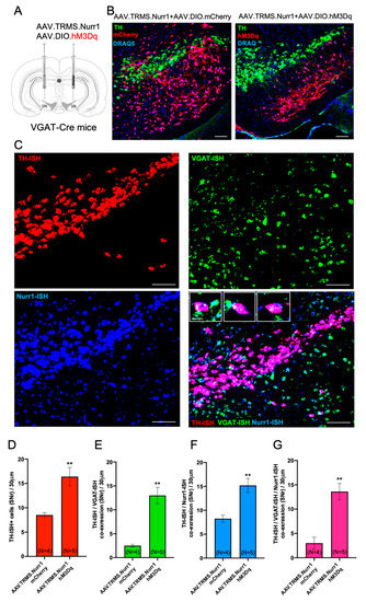 To test whether concomitant activation of GABAergic neurons and Nurr1 overexpression is sufficient to induce TH plasticity in the SN, VGAT-Cre mice were injected with Cre-dependent excitatory mCherry-DREADD (hM3Dq) or mCherry control virus and pan-neuronal Nurr1+ (Figure 9A,B). Four weeks after viral injections, mice received 0.01 mg/kg clozapine i.p., twice daily for 14 days to induce chronic activation of GABAergic cells in the SN. RNAscope in situ hybridization showed that Nurr1-hM3Dq mice displayed a significant increase in the total number of TH-ISH cells as well as TH/VGAT-ISH co-expression in the SN (Figure 9D, mean ± SEM: Nurr1+-mCherry = 8.5 ± 0.5, Nurr1-hM3Dq = 11 ± 1.7, t(7) = 3.61, p < 0.01p; Figure 9E Nurr1+-mCherry = 2.5 ± 0.2, Nurr1-hM3Dq = 13 ± 1.7, t(7) = 5.39, p < 0.01p) compared to Nurr1-mCherry mice. In addition, TH/Nurr1-ISH co-expression and TH/VGAT/Nurr1+ co-expression increased in Nurr1-hM3Dq mice compared to Nurr1-mCherry mice (Figure 9F, mean ± SEM: Nurr1+-mCherry = 8.2 ± 0.7, Nurr1-hM3Dq = 15.2 ± 1.4, t(7) = 3.89, p < 0.01p; Figure 9G Nurr1+-mCherry = 3.0 ± 1.2, Nurr1-hM3Dq = 13.6 ± 1.6, t(7) = 4.82, p < 0.01p).