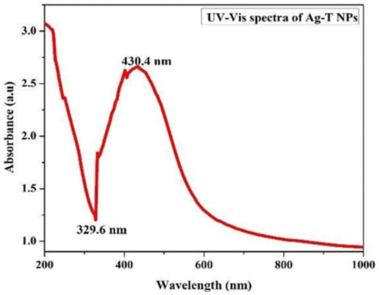 Preliminary investigations of Ag-T-NPs formation were carried out with an ultraviolet-visible (UV-Vis) spectroscopic analysis from 200 to 800 nm. The peak occurringat 430.4 nm for the Ag-T NPs is usually the characteristic surface plasmon resonance (SPR) peak for metal nanoparticles when their reactions are carried out in laboratory conditions. The UV–visible spectrum of the aqueous medium containing Ag-T-NPs showed an absorption peak around 430.4 nm, as shown in Figure 1.