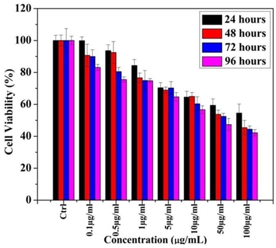 From the MTT assay, it was observed that, at 1 µg/mL, cell viability reduces appreciably after 24 hours (h) and remains unchanged for 72 and 96 h. At 24 h, cell viability decreases with an increased concentration of NPs. The same trend was observed for 48, 72, and 96 h of exposure time. Concentrations that were higher than 5 µg/mL showed a reduced cell viability compared toremaining concentrations. This finding suggested that cytotoxicity induced by the Ag-T-NPs is time- and concentration-dependent.