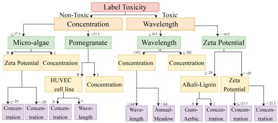 The DT and RF models demonstrated optimum accuracy through the nine input parameters, and conditions were imposed on the dataset for performing the CART (Classification and Regression Tree) algorithm. The prediction metrics were utilized to check the accuracy of our predictions and convey the numeral deviation from actual values. The mean square error (MSE), root mean square error (RMSE), mean absolute error (MAE), and R2 are all measures used to assess the model’s effectiveness in regression analysis. MSE is the average squared difference between the original and predicted values in the dataset. In contrast, MAE is the average of the absolute error difference between the actual and anticipated values in the dataset, i.e., assessing the variance of the residuals. RMSE measures the standard deviation of the residuals. R2 measures how well a regression model fits a dataset and how well it reproduces observed findings based on the proportion of total variation in outcomes that the model is responsible for explaining. Figure 3 and Figure 4 show the Decision Tree obtained according to the classification based on the cell lines and their toxicity.