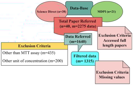 Several efforts have been made in recent years to develop classic Quantitative Structure–Toxicity Relationship (QSTR) models. Unfortunately, their development is challenged by the inadequate number of toxicity-relevant physicochemical data in the dataset [,]. In contrast, the mature method called literature data mining (meta-analysis) is well known for establishing the relationships between the structural attributes and the toxic effects of numerous fabricated nanoparticles [,,]. For data collection, the preferred keywords were “silver nanoparticles for cytotoxicity.” To avoid replication, we restricted ourselves to two different databases. One was ScienceDirect, and the other was MDPI. Also, we focused on the latest research outcomes in cytotoxicity and acquired the data from October 2017 to April 2022. We focused only on the latest research articles; therefore, we could not obtain sufficient data with only Ag-NPs as keywords for MTT assay. Thus, we increased the data by including chemically- and biologically-synthesized silver-modified nanoparticles. We found around 38 research articles from ScienceDirect and 21 from MDPI. Out of 59 articles, approximately 39 papers were accessed, and the 40th paper was our own previously reported article []. Finally, we collected 2275 datasets (cell viability and their corresponding dosages, i.e., concentrations of NPs). Of 2275 data sets, 435 were excluded because different assays were used to study the cytotoxicity other than the MTT assay. Two-hundred more data points were excluded, as the concentrations were measured in other forms rather than μg/mL. The outcome of the data mining was 1640 data points. Out of 1640 data points, 815 data points were of carcinoma cell lines and 825 data points were of normal cell lines. Further, 325 data points were discarded from normal cell lines due to more than 50% of the parameters missing out of the 9 inputs considered for the Machine Learning algorithm. Finally, 1315 filtered data points (500 normal cell lines and 815 carcinoma cell lines) from 40 articles, with the previously mentioned 9 different input features in determining cytotoxicity tested using MTT assay, were used. The schematic representation of the selection criteria of the datasets is shown in Figure 6.