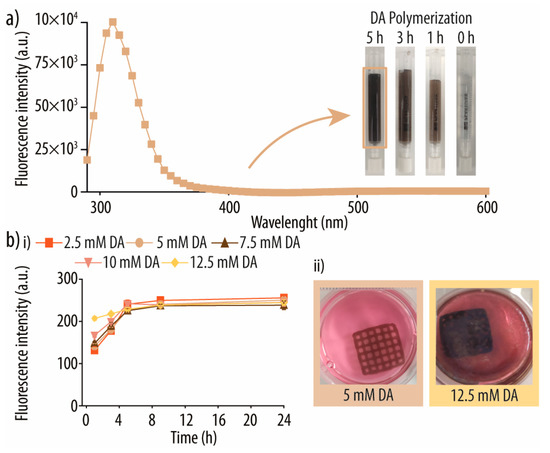 Over recent years, several studies confirmed that GB hydrogels have better stability and longevity than Guo-only hydrogel formulations [19,20], and hence GB hydrogels are now regarded as the gold standard of Guo-based hydrogels [18,19,50,51]. Following a recently developed protocol for self-assembled injectable GB hydrogels (to be published), a GB hydrogel solution (90 mM Guo, 40 mM BA, and 40 mM potassium hydroxide (KOH)) was mixed with DA at various concentrations (2.5, 5.0, 7.5, 10, and 12.5 mM). To ensure maximal PDA loading into the hydrogel, we measured the fluorescence intensity reading of formed PDA after distinct incubation times and using different DA concentrations. Importantly, after successful polymerization into PDA, DA exhibits a distinctive emission peak at 310 nm at an excitation wavelength of 260 nm (Figure 1a; control samples are shown in Figure S1 of the Supporting Information). Simultaneously, PDA formation leads to a deep brown coloring of the hydrogel solution (Figure 1a, right inset). We detected a time-dependent and linear increase in fluorescence intensity for all tested DA concentrations, and PDA formation appeared complete after 5 h in all conditions (Figure 1(bi)). Notably, once the hydrogels were printed and immersed in a complete medium, the supernatants of PGB hydrogels prepared with 10 and 12.5 mM DA turned deep brown and opaque, while the ones prepared with 2.5, 5.0, and 7.5 mM stayed translucent (Figure 1(bii)). Thus, we concluded that both 10 and 12.5 mM DA were too much to be accommodated by the hydrogel, leading to the polymerization of considerable amounts outside in the surrounding fluid. Thus, we continued the optimization of gel-embedded PDA using DA concentrations of 2.5, 5.0, and 7.5 mM. Of note, others previously reported that BA/DA ratios of higher than 3 disallow the auto-oxidation of DA into PDA [52]. However, in our situation, most of the BA is already involved in the guanosine borate hydrogel network and is thus not able to interfere anymore with PDA formation.