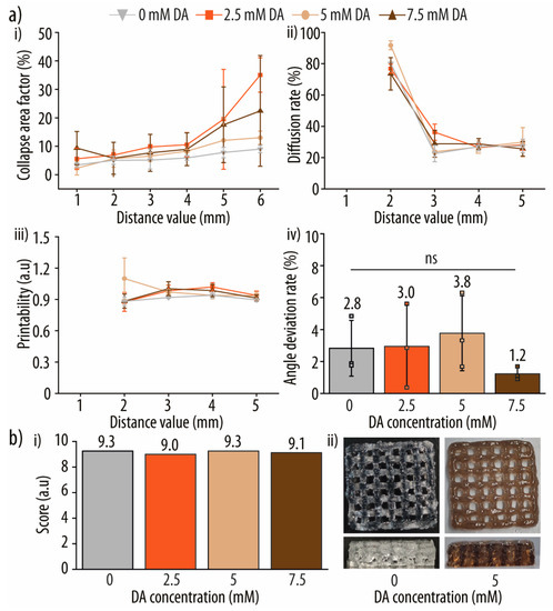 Next, to assess the ink behavior during changes in printing direction, the angle printing was evaluated. For this, the top right square of each printed pattern was used for determining the Da by ImageJ [57]. In detail, the center points of each corner were joined and the enclosed angles were calculated. All of the tested inks had Da values of less than 3%, with the hydrogel using 7.5 mM of Da performing best with a Da of just under 2%.
