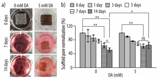 To gain a better understanding of the PDA coating effect on GB hydrogels, we examined the stability of the printed PGB hydrogel by incubating it in a complete medium at 37 °C for up to 14 days. Over the first 48 h, a reduction of ~30% in the normalized scaffold area was observed. This might be explained by the contraction or shrinkage of the hydrogel due to water loss from the hydrogel network as a result of the higher ionic strength or a difference in pH in the surrounding medium (Figure 3a) [59]. However, no significant differences were seen between GB hydrogels with and without PDA coating. Thus, we next assessed the development of the pore area over time (Figure 3b), a key parameter of hydrogel stability, as water loss from the printed hydrogel, for example, due to a higher ionic strength or different pH in the surrounding medium, can lead to significant hydrogel contraction (shrinkage) [59]. After an initial ~20% decrease in the first 3 days, the pore area of the PGB hydrogel stabilized and did not decrease much more throughout the remaining days. On the other hand, the pore area of GB hydrogels dropped significantly and consistently over 14 days, indicating that the PDA coating of the network indeed led to a more stable hydrogel by increasing its robustness and resilience.