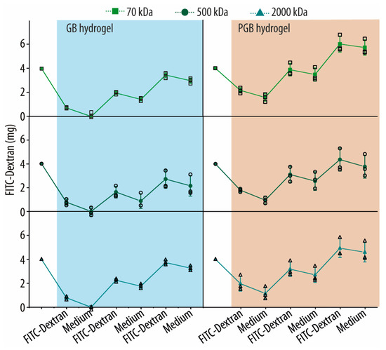 Cell migration into and also within printed 3D scaffolds is critical for successful tissue regeneration of considerable size defects, as otherwise, the diffusion limits of oxygen, nutrients, and metabolites in the scaffold may obstruct scaffold integration [60,61,62]. Thus, we performed a series of in vitro tests. After 10 h of immersion in three different fluorescein isothiocyanate-dextran (FITC-Dextran) solutions, ~50% of the 70, 500, and 2000 kDa molecules (~1.8 to 2.2 mg) were able to diffuse into 1.5 mL of printed hydrogel (Figure 4). Next, the FITC-loaded hydrogels were immersed in fresh media for the same time period, which led to the release of 25 to 45% of the previously entrapped molecules. Notably, the 70 kDa FITC-Dextran was retained best, while the 500 and 2000 kDa versions behaved very similarly. Next, we reloaded and washed the PGB hydrogels two times more, both times increasing the amount of adsorbed FITC-Dextran for all three molecular weight variants over time. In each step, the amount of loaded FITC-Dextran increased by 42 to 77%, resulting in a final loading capacity of 6.0, 4.4, and 4.9 mg of FITC-Dextran, respectively. For GB hydrogels, the same trend was observed but significantly less FITC-Dextran was retained in the network. For example, initial FITC-Dextran loading resulted in only a ~20% uptake of the provided molecules into the hydrogel, which was also nearly completely removed during the following wash step. Only subsequent loading/washing cycles enabled an entrapment of FITC-Dextran molecules, leading to a final loading capacity of 3.0, 2.1, and 3.3 mg of 70, 500, and 2000 kDa FITC-Dextran, which is approx. 45-30% less than in the PDA-treated ones. This demonstrates that the GB hydrogel network comprises FITC-Dextran interaction sites, which are amplified by the presence of PDA. This is consistent with previous reports stating that PDA coatings have a high reactivity for secondary functionalization due to their many functional groups and can likewise bind or retain a wide range of bioactive molecules, such as proteins, peptides, and growth factors, by lowering their diffusivity [63,64].