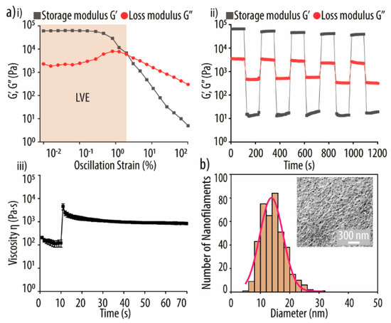 First, the elastic nature of the hydrogel was evaluated using strain amplitudes ranging from 0.01 to 100% at an oscillation frequency of 1 Hz (Figure 5(ai)). At low shear strain values, G′ was larger than G″. However, a turning point was identified at an oscillation strain of 1.24%, and beyond that point, the revere behavior was detected (1.26, see Figure S2a, Supplementary Materials). The observed trend is caused by the breakdown of intermolecular or π- π stacking interactions, as the system is no longer in the linear viscoelastic region (LVE). Thus, to ensure an elastic behavior of the PGB hydrogel, we used a strain of 0.1% in subsequent experiments [67,68].