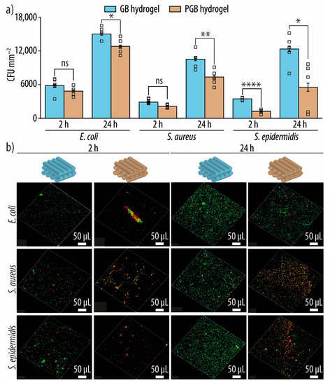 (a) Bacterial adhesion and early biofilm formation of E. coli, S. aureus, and S. epidermidis onto PGB and GB hydrogels after 2 and 24 h of incubation at 37 °C. n = 3; * p ≤ 0.05; ** p ≤ 0.01; **** p ≤ 0.0001. (b) Live/dead staining of E. coli, S. aureus, and S. epidermidis after 2 and 24 h of incubation at 37 °C in GB and PGB hydrogels.