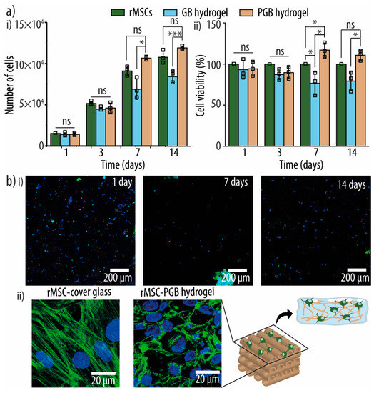 The cell morphology of rMSCs was evaluated using CLSM and staining of nuclei and actin filaments. Figure 7(bii) demonstrates the successful adhesion of rMSCs onto the hydrogel after 14 days. However, while cells seeded onto TCPS plates exhibited a well-defined cytoskeleton, only an initial cytoskeleton definition and a spread-roundish cell morphology could be detected for our PGB hydrogels. However, while the observed cell morphology may be imperfect, both cell proliferation and survival confirmed that our PGB hydrogels can be functionalized with living cells, and the introduction of additional bioactive molecules may improve cell differentiation in the future.