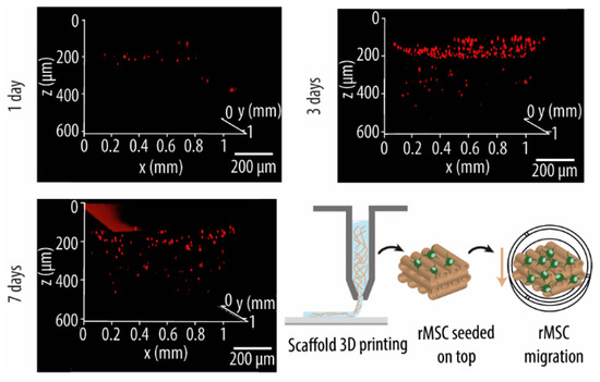 A common problem of cell-functionalized scaffolds is the often poor colonization of the scaffold core [85,86]. This might be caused by excessive cell growth on the scaffold surface, leading to cell accumulation and, as a result, sealing of the scaffold’s pore structure and halting cell migration and/or nutrition uptake into the scaffold. Thus, we studied cell migration into the PGB hydrogel by analyzing the z-projection of the cells’ location on days 1, 3, and 7 (Figure 8). While the majority of rMSCs were found on the surface on day 1, the first cells had penetrated the scaffold by day 3. Over the following days, cells dispersed along the nanofibrillar hydrogel network, and by day 7, cells had colonized the hydrogel core, and a fair dispersion of cells within the scaffold was observed. Additionally, we calculated the migratory speed of rMSCs in z direction at these time points and determined values of 9.0 ± 4.6, 5.1 ± 0.2, and 2.5 ± 0.3 µm h−1, respectively. The quickest z-migration was found on day 1, which might be explained by the fact that over time, cells colonize the scaffold not only in z (penetration) but also in x and y (dispersion) directions, and the latter are not detected in our experimental set-up. Notably, recent studies have suggested that PDA coatings may boost migratory speed due to fibronectin depositions and subsequent integrin activation [87,88]. Likewise, the presence of PDA may modify the focal adhesion features of the hydrogel and thus facilitate improved cell movement.