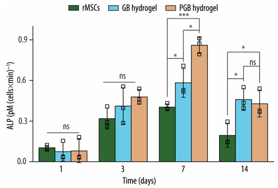 One reason to incorporate PDA into the hydrogel was to increase the osteogenic activity of the GB hydrogels since several reports have demonstrated its ability to stimulate osteogenic differentiation in vitro [27,28,88]. Thus, we tested for alkaline phosphatase (ALP) activity as it is a strong indicator for early-stage osteogenesis (Figure 9). Notably, a significant increase in ALP activity was detected after 7 days of cell culture, both compared to GB hydrogels and rMSCs cultured alone, followed by a decrease at 14 days to levels seen after 3 days. Importantly, this is not surprising as PDA mainly plays a role in early cell differentiation [63]. These results may indicate that the presence of PDA may be sufficient to elicit an osteogenic response of rMSCs in GB hydrogels; however, additional biomolecules may improve differentiation. Nevertheless, the detected ALP expression and activity clearly demonstrate the functionality of the hydrogel-embedded rMSCs and prove that our PGB hydrogel scaffold can indeed be functionalized by living cells.
