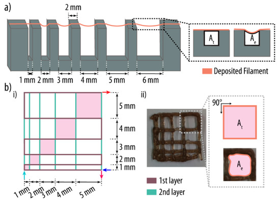 The Cf (Equation (1)) of the printed hydrogel was determined by the mid-span deflection of the hanging filament. After 5 h of hydrogelation and polymerization in the syringe at room temperature, a filament was deposited onto the platform (Figure 10a) with the nozzle tip being placed 0.3 mm above the top surface of the pillars, and printing was stopped 5 mm after the last pillar. An image of the deposited filament was taken 1 min after the printing and the area under the filament was calculated using ImageJ [57]. The Cf is calculated as the percentage of the deflected area after filament suspension versus the theoretical area [54,55]: