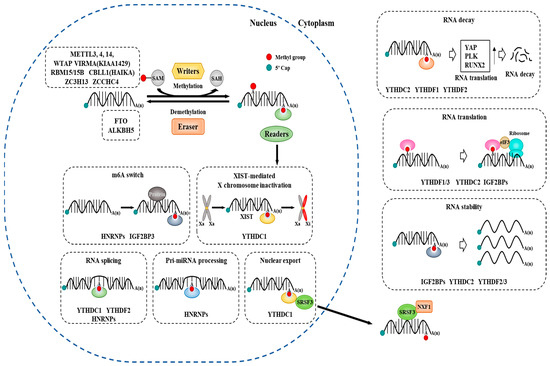 RNA methylation acts as a critical regulator of gene expression. RNA methylations include N6-methyladenosine (m6A), N1-methyladenosine (m1A), 5-methylcytosine (m5C), 5-hydroxymethyl cytosine (hm5C), and N7-methylguanosine (m7G) [1,2,3]. N 6-methyladenosine (m6A) is the most prevalent epitranscriptomic internal modification of RNAs in eukaryotes [4,5,6,7]. m6A is enriched around stop codons, in 5′- and 3′-untranslated regions, and within long internal exons. m6A modifications occur in various RNAs, including messenger RNAs (mRNAs), ribosomal RNAs (rRNAs), transfer RNAs (tRNAs), circular RNAs (circRNAs), microRNAs (miRNAs), and long non-coding RNAs (lncRNAs). The effects of m6A modifications on non-coding RNAs (such as miRNA, lncRNA, and circRNA) include the modulation of pri-miRNA processing, lncRNA–protein, and lncRNA–RNA interaction, and circRNA transport [8]. m6A-mediated RNA methylations play a pivotal role in various cellular processes such as hematopoiesis, neurogenesis, cell differentiation, zygotic development, immune response, and tumorigenesis [9,10,11,12,13,14,15,16,17,18,19,20,21]. m6A regulators play crucial roles in various life processes by regulating RNA stability, mRNA splicing, translation or decay, and miRNA processing [17,18].