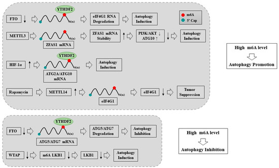 m6A plays a critical role in regulating macroautophagy/autophagy by targeting ATG5 and ATG7. The downregulation of FTO in OSCC cell lines decreased the expression of eIF4G1, enhanced autophagic flux, and inhibited tumorigenesis [147]. YTHDF2 captured eIF4G1 transcripts containing m6A and induced mRNA degradation, thereby promoting autophagy and reducing tumor occurrence [147]. m6A modification enhanced the stability of ZFAS1 [148]. Lnc RNA ZFAS1 is upregulated in tumor tissues and neural progenitor cells (NPC) [148]. ZFAS1 upregulated the expression of ATG10 and regulated autophagy by inhibiting the PI3K/Akt signaling pathway to promote the proliferation and migration of NPC cells [148]. High levels of YTHDF1 could predict the poor prognosis of patients with HCC [149]. YTHDF1 deficiency inhibited HCC autophagy, growth, and metastasis [149]. YTHDF1 enhanced the translation of autophagy-related genes ATG2A and ATG14 by binding to m6A-modified ATG2A and ATG14 mRNA, thus facilitating autophagy and the autophagy-related malignancy of HCC [149]. These reports suggest that high levels of m6A promote autophagy (Figure 2).